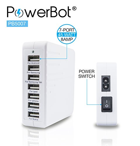 • PowerBot PB5007 7 Multiple USB Port - This portable fast Wall / Desktop charger simultaneously charges up to 7 devices at once. It charges your Apple iPhone 6, 5, 5s, 4, 4s, iPad 5, Mini, MP3 Players, iPod touch 4th generation, Samsung galaxy S5, S4, S3, Tab 2.0. Nexus 4, Xoom, Kindle fire HD, Tablet, Barnes Noble Nook, blu electronic cigarette. Safely use any port for any device with any USB charger cord.